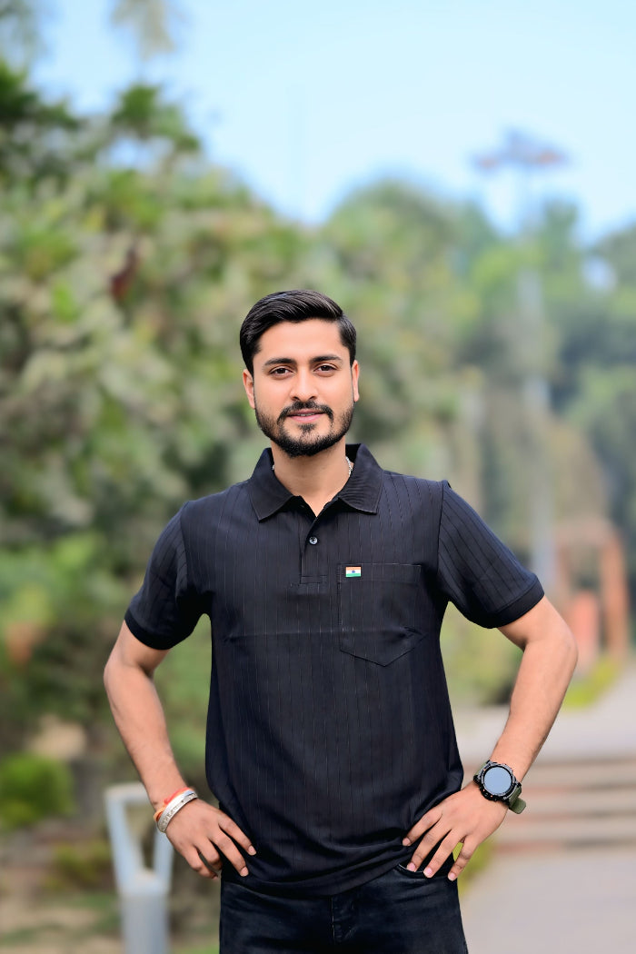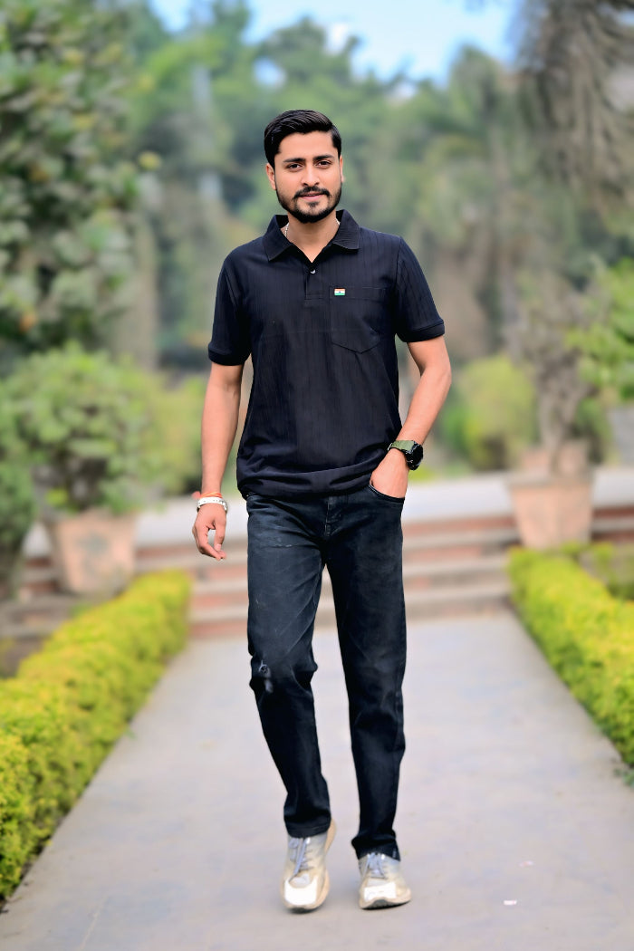 The Black Half Sleeve Polo T-Shirt with Indian Flag is designed for men who prefer understated style with a bold identity. Featuring a classic polo collar and a sleek solid-black finish, this t-shirt delivers a powerful look that works effortlessly from workouts to casual outings.